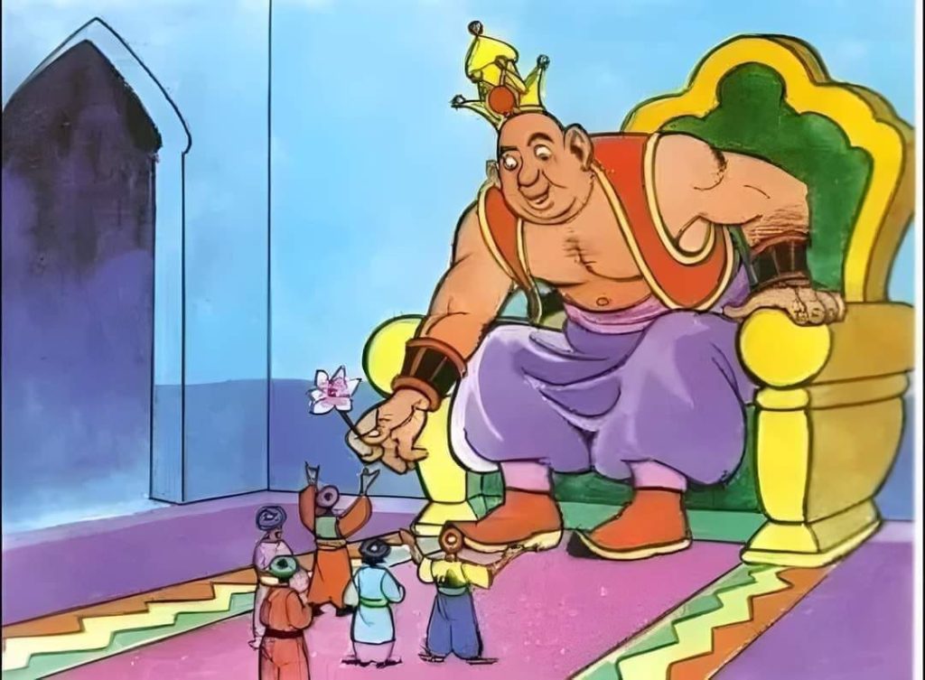 فكر الملك العملاق والاقزام في خطة لاسترجاع المملكة المسروقة وسأله كبير الاقزام إن كان لدى الوزير الطماع